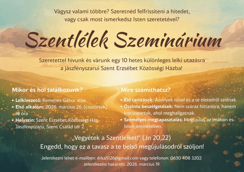 Lelkivezető: Kemenes Gábor atya, helyszín: Szent Erzsébet Közösségi Ház, Jászfényszaru, Szent Család tér 2. Az első alkalom 2026. március 26-án, csütörtökön, 18.00 órai kezdettel lesz. A jelentkezés részleteit a mellékelt plakáton megtalálod.