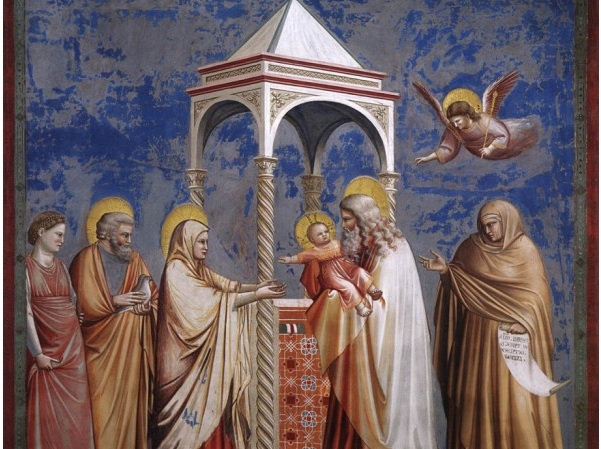 A szokásnak megfelelően a szülők, Mária és József áldozatként két gerlicét vagy galambfiókát ajánlottak fel, és az Úrnak szentelték az elsőszülött fiút. A mózesi törvény szerint előírt áldozat fölajánlásakor jelen volt Anna és Simeon is, aki a nemzeteket megvilágosító világosságnak nevezte Jézust.