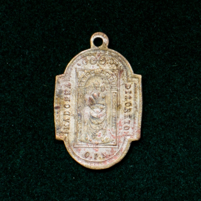 Az első tárgy egy Szűz Máriás medál, az egyik oldalán "Madonna di Loreto O.P.N.", a másik oldalán "Sancta Maria Lauretana Ora Pro Nobis" (mindkettő jelentés: "Loretói Madonna/Szűz Mária, imádkozz értünk") feliratokkal. A másik tárgy pedig egy a körmöcbányai pénzverdében 1900-ban vert 1 filléres érme.